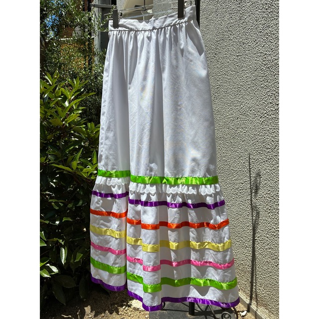 カラフルなリボンがアクセントになった70sスカート✳︎ 古着らしいとても良いデザインだと思います◎ オールホワイトのスタイリングにもオススメです。 ホワイトですが汚れもなく、状態かなり良いです。 生地もハリ感があり使用感が見られないため、おそらくデッドストックかと思われます。 なかなか見つからないロングスカートですので気になられた方は是非◎ 状態:目立ったダメージなし。 生地:コットン50% ポリエステル50% サイズ表記:8 ウエスト:約66cm 着丈:約94cm ●当店はアメリカ買い付けの古着、vintage雑貨を扱っております。 usedなので程度は異なりますが、 中には目立つ汚れやダメージがあったり、ボタンやジッパーの欠損、生地が薄くなった商品といったものもございます。 ●サイズについて 平置き採寸しております。測定値の誤差はご了承下さい。 ●説明文や商品画像でご紹介しておりますが、 ダメージや汚れがご心配なお客様は、ご注文前にお気軽にご相談下さい。 ●また、商品画像は出来る限り実物の物と同じ色味になるよう撮影しておりますが、多少異なる場合もございます。 上記内容にご理解いただけないお客様、商品状態が心配なお客様は、恐れ入りますがご購入をお勧めしませんので、ご確認宜しくお願い致します。
