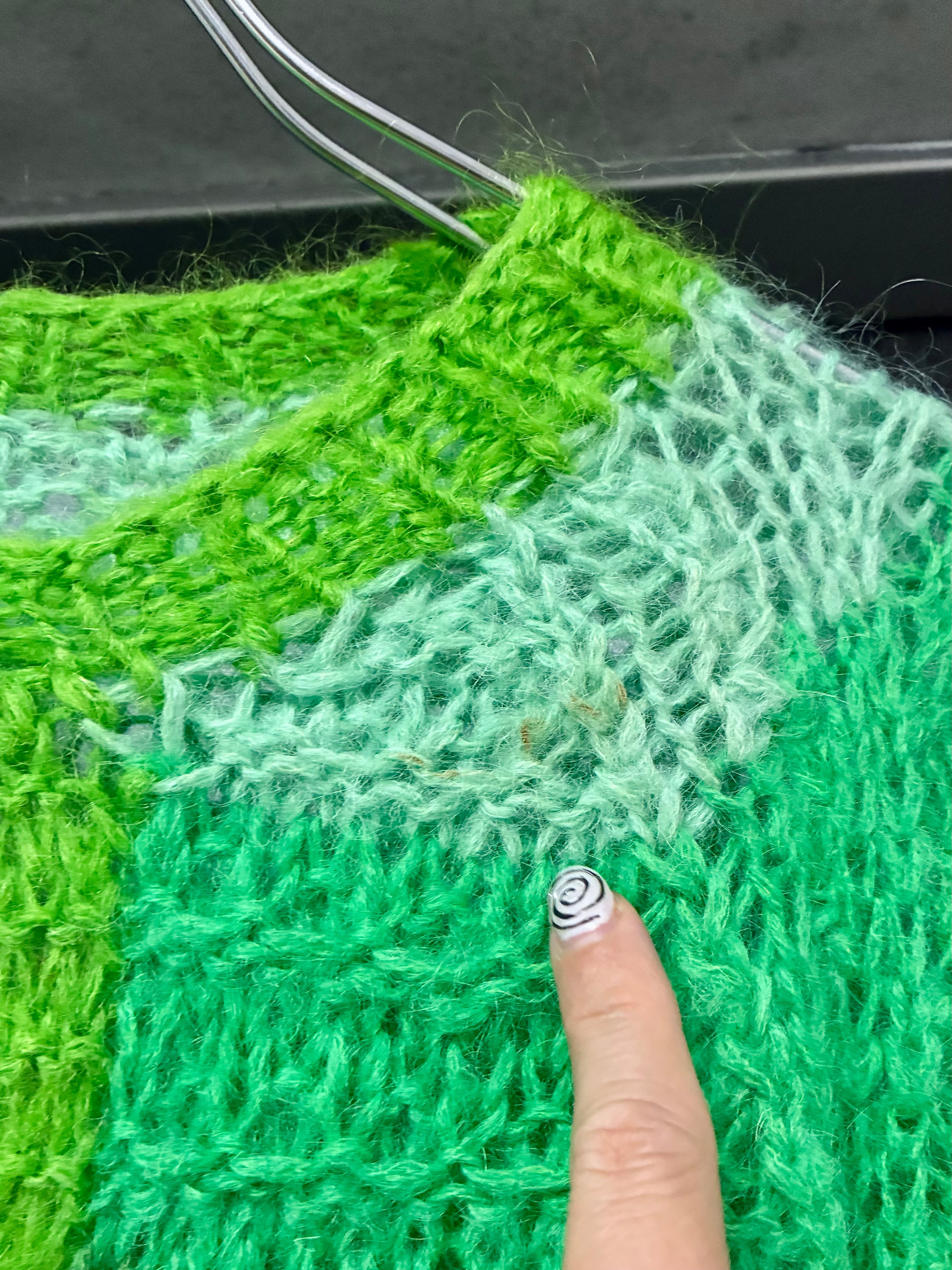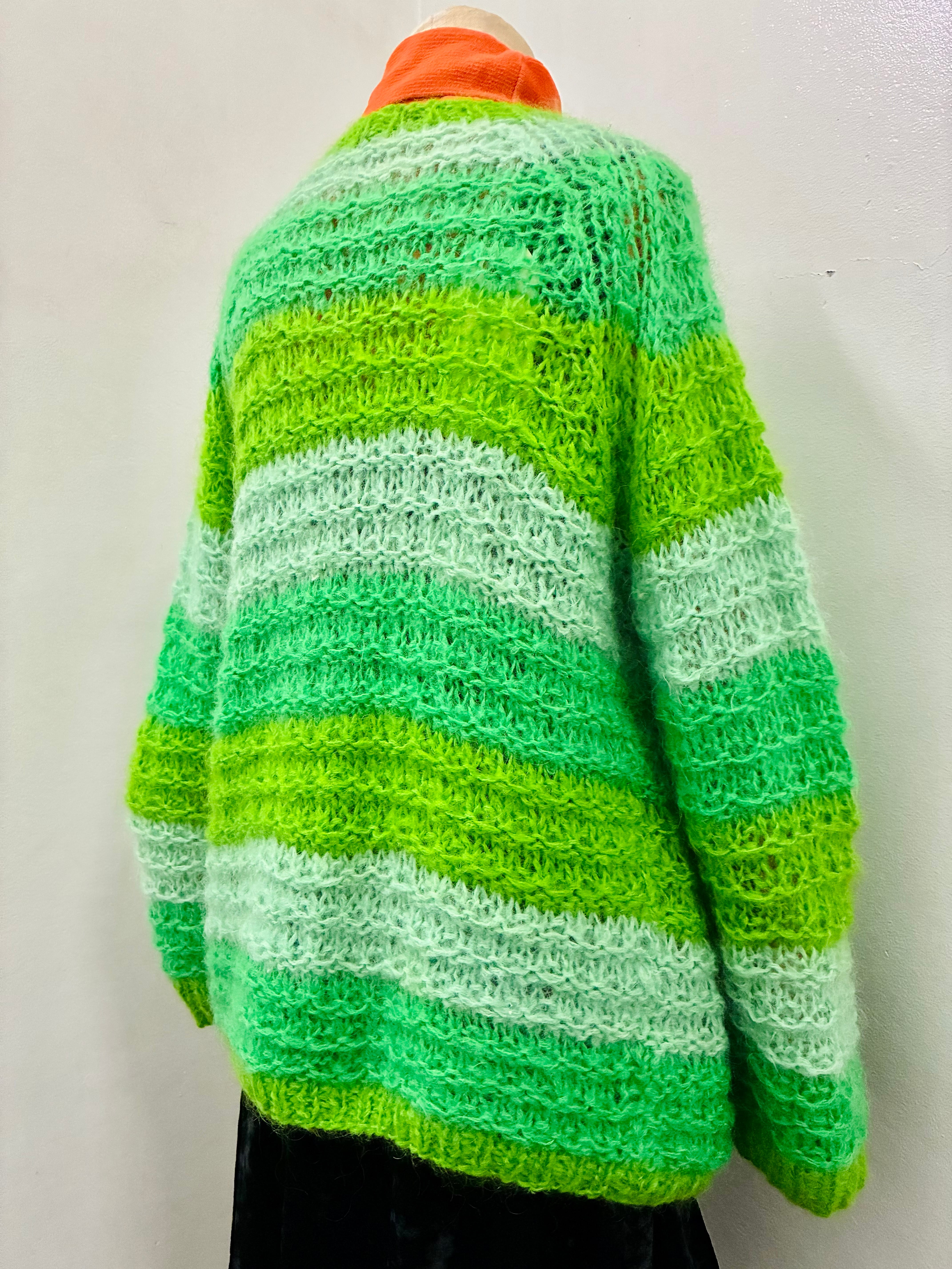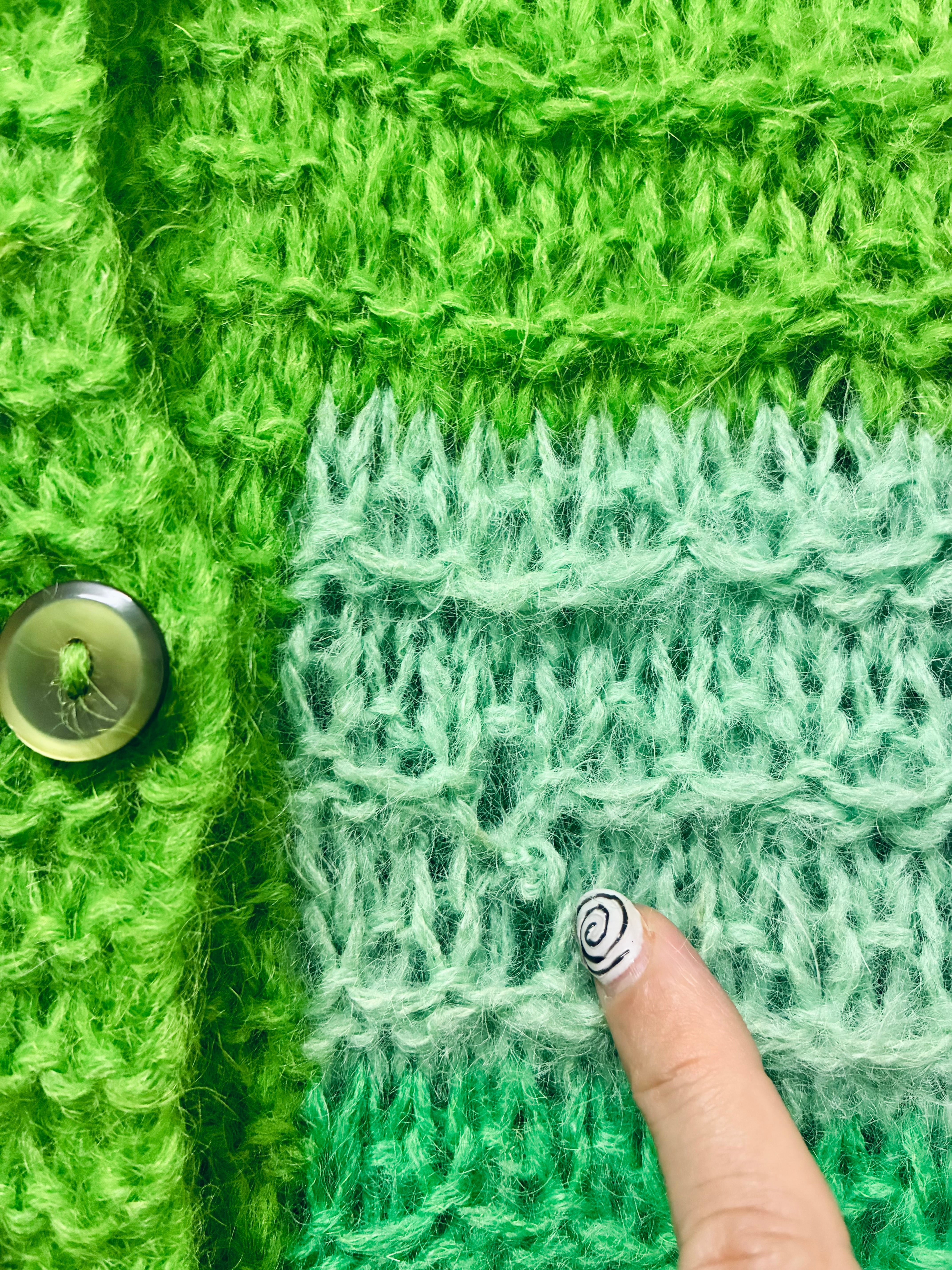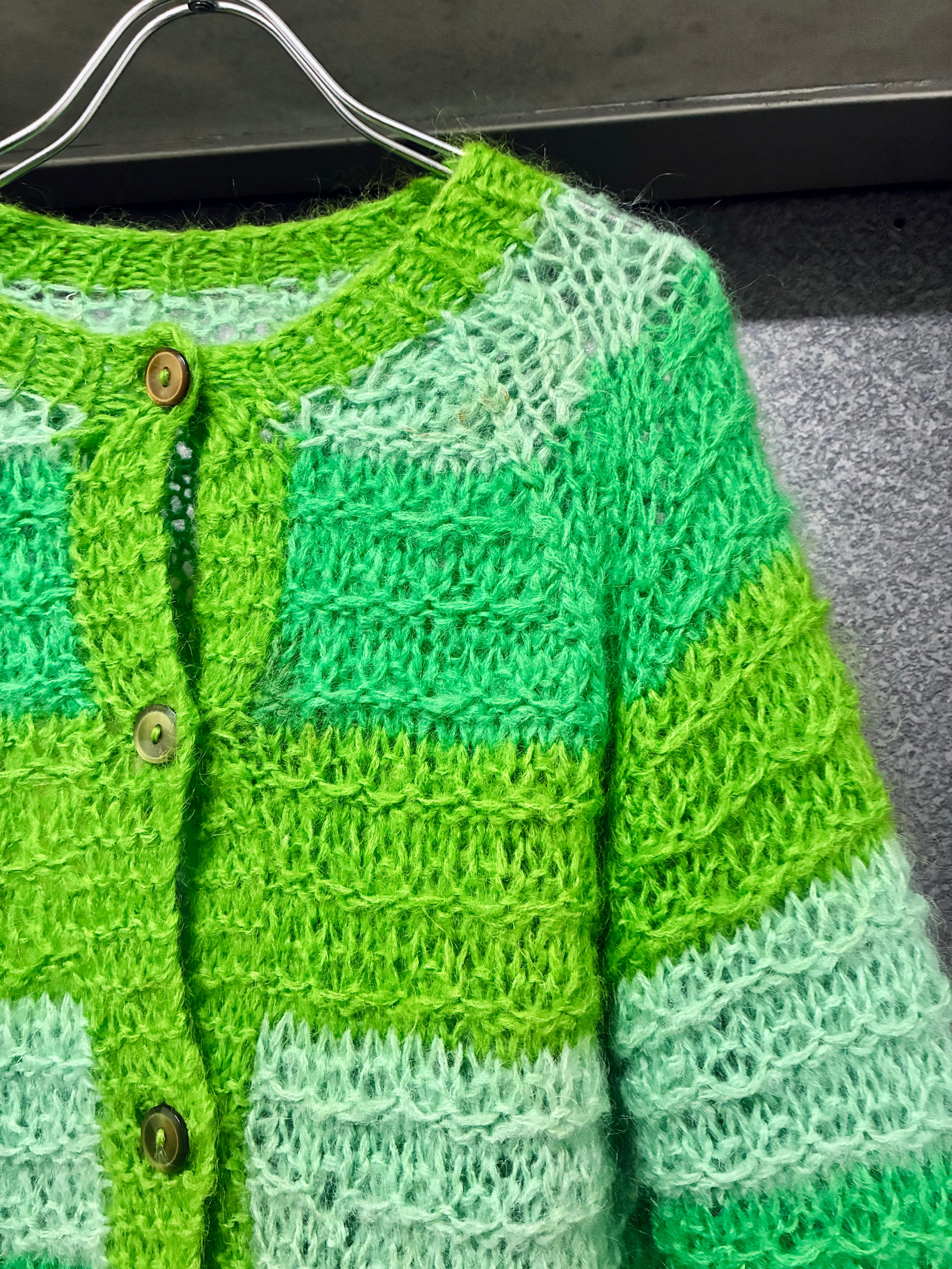 鮮やかな配色が可愛いグリーンのニットカーディガン◎