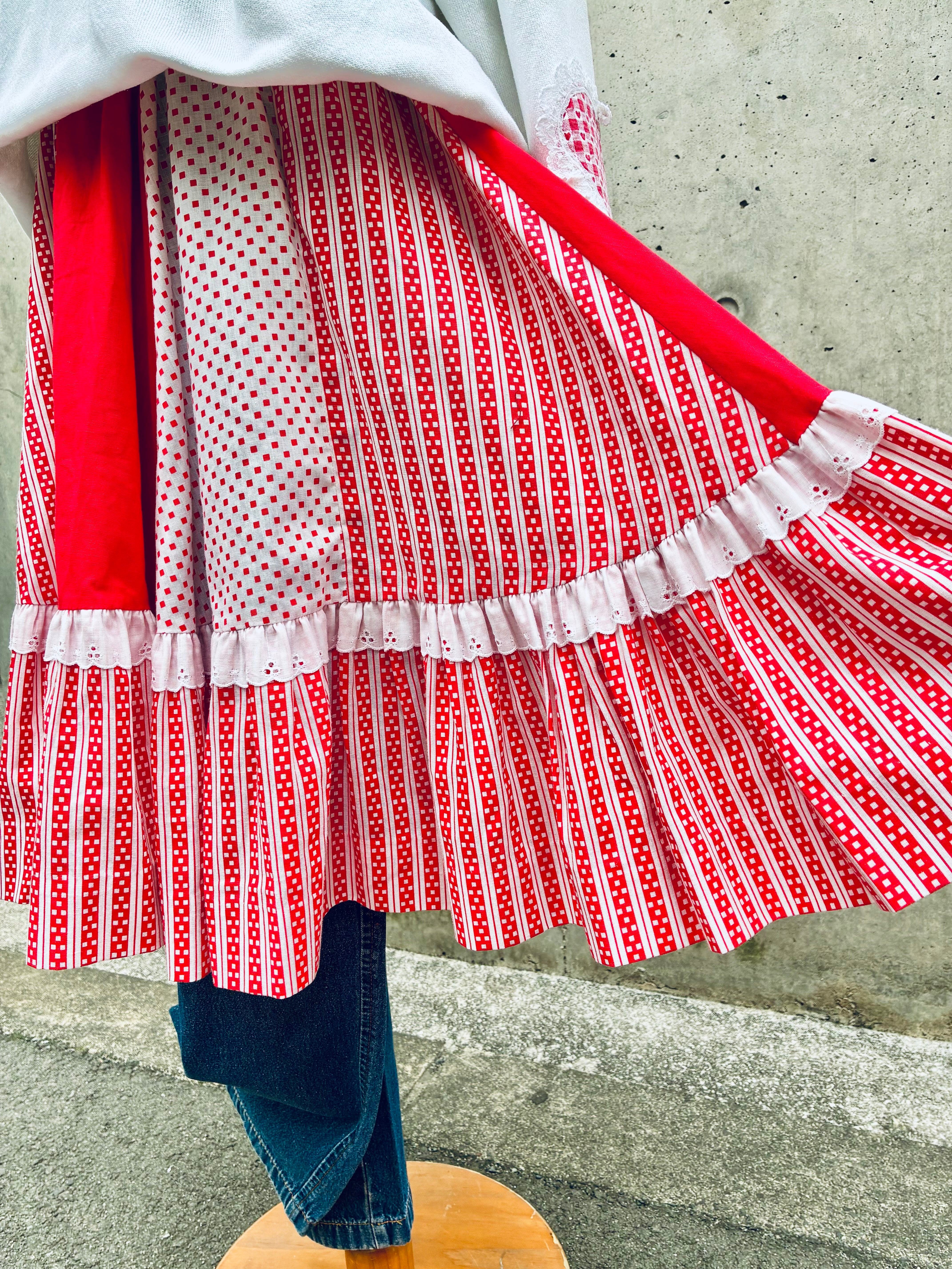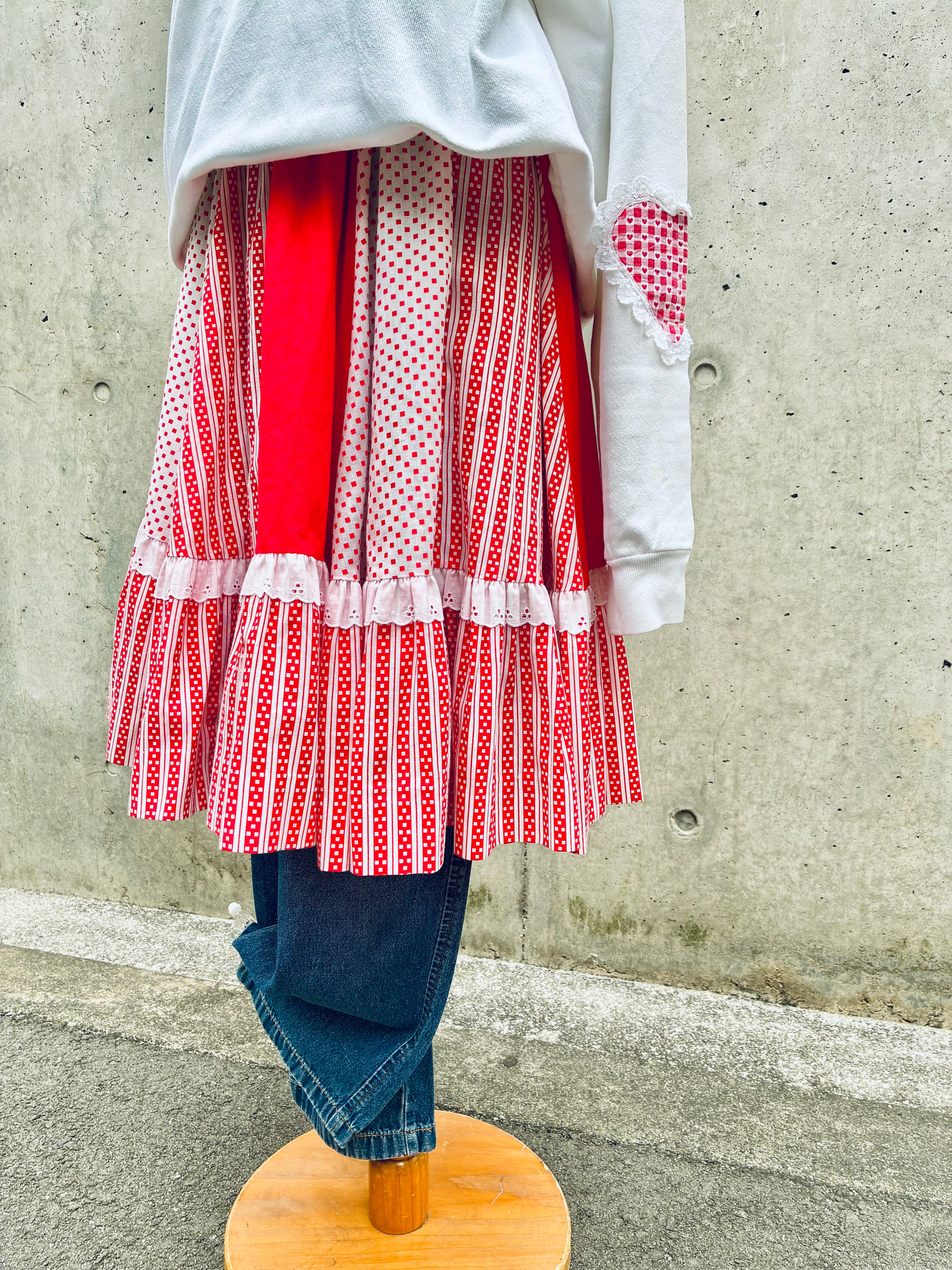 レッド&ホワイトのパッチワークスカート。