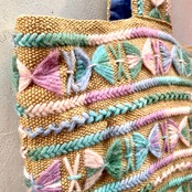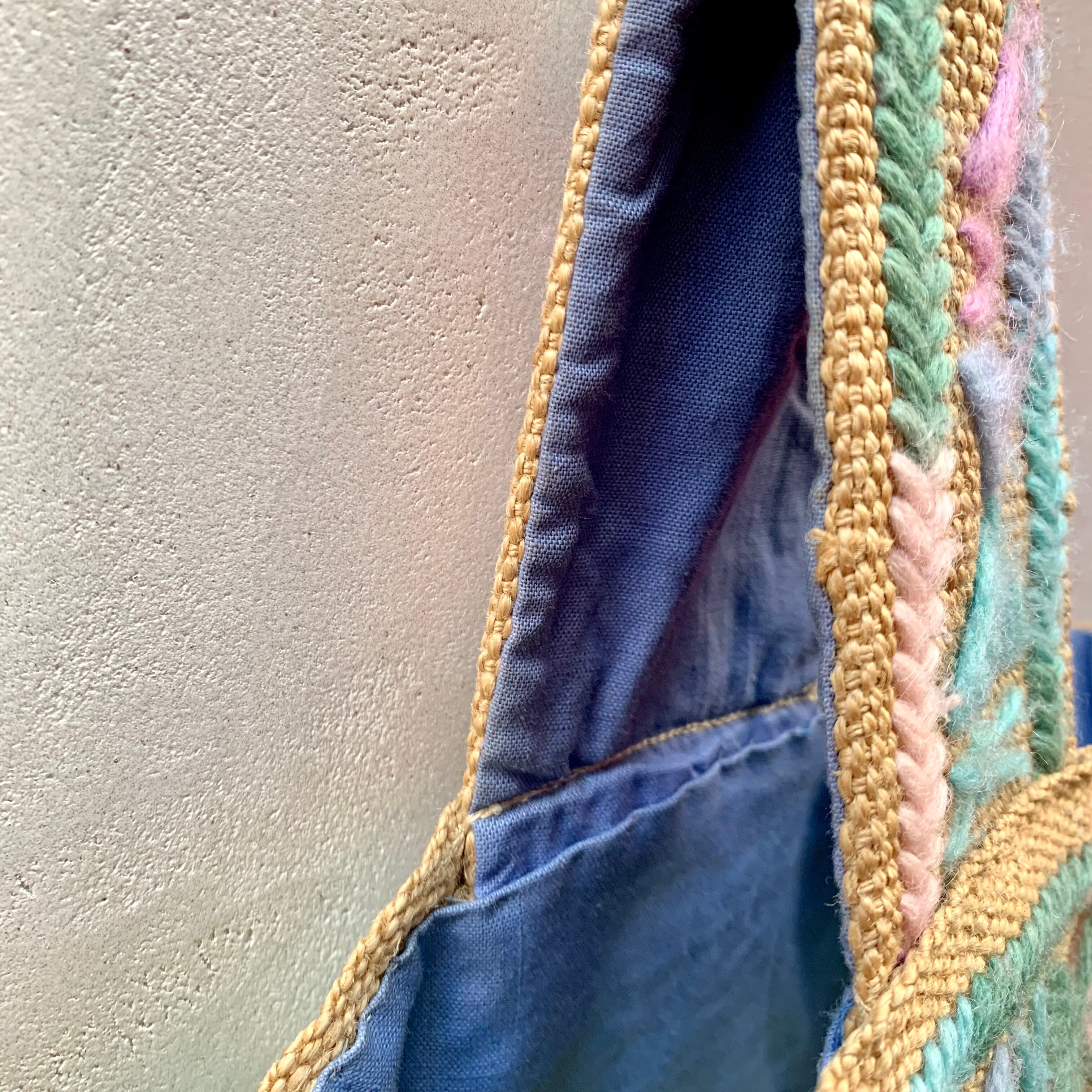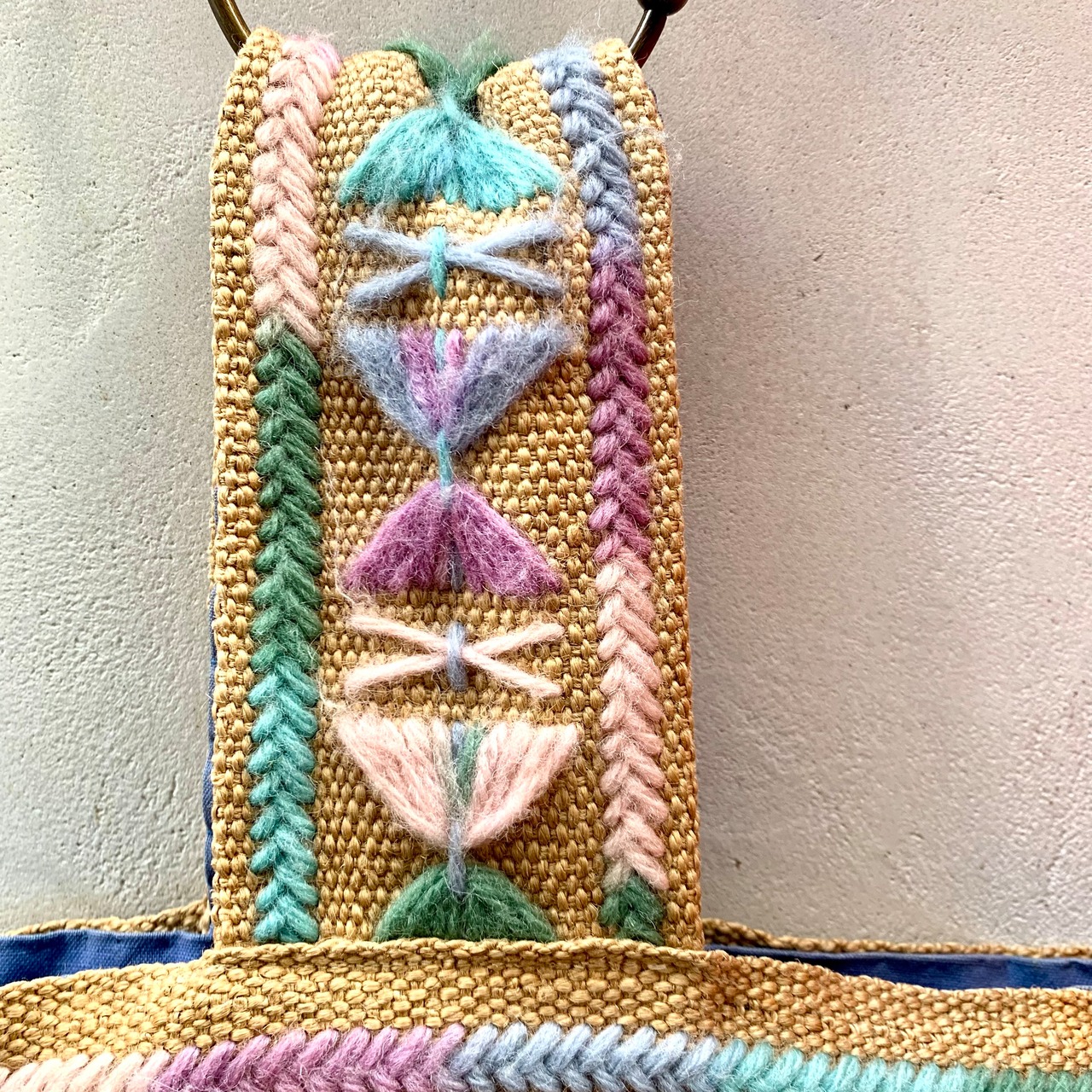 70年代頃のジュート素材にパステルカラーの毛糸で刺繍されたハンドメイドバッグです。