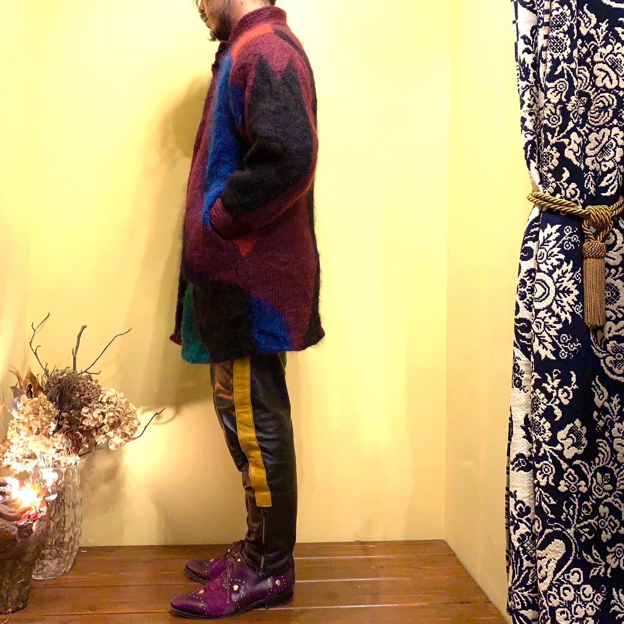 柄のデザイン性豊かなモヘアロングジャケット。