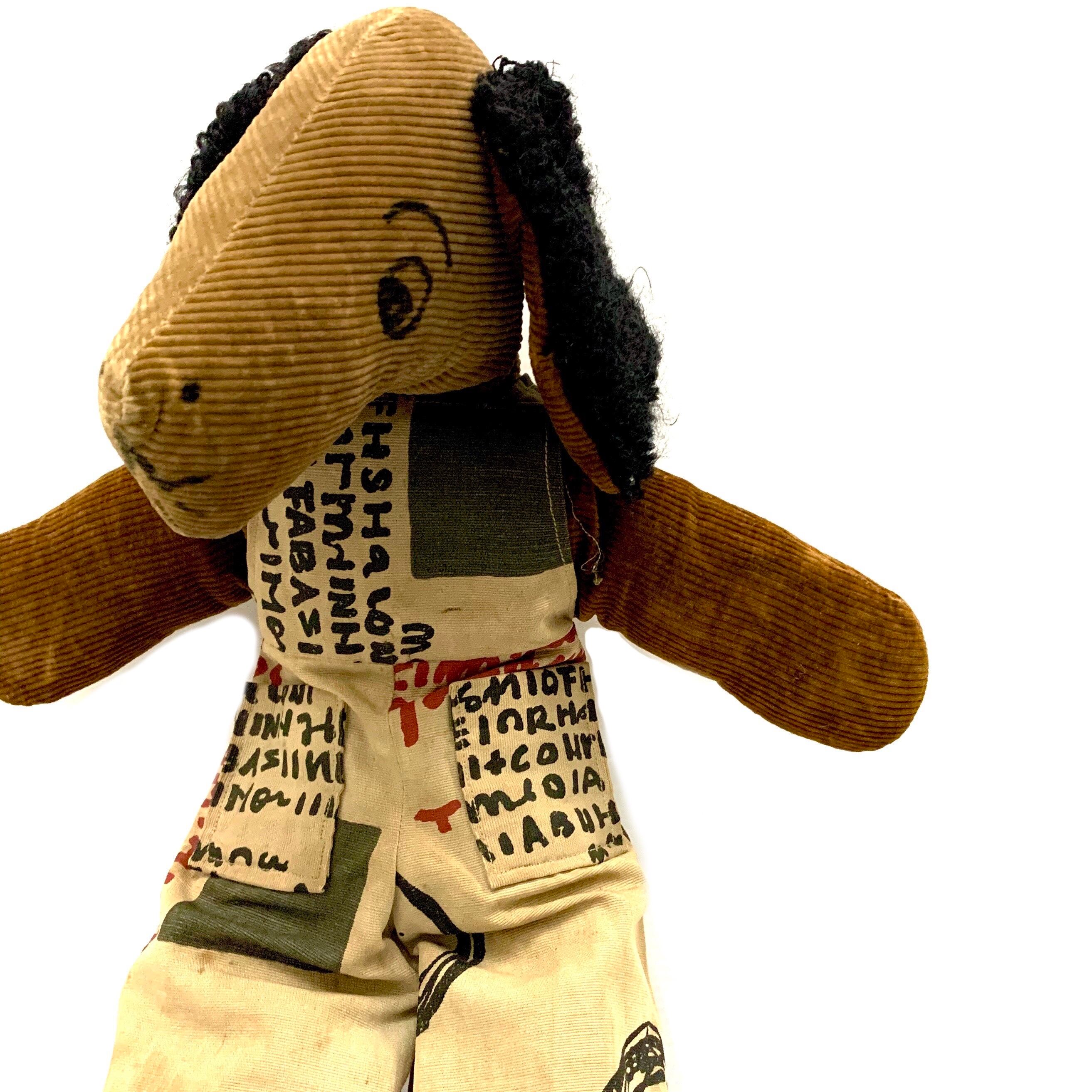 オーバーオールを着たワンちゃんのぬいぐるみ。