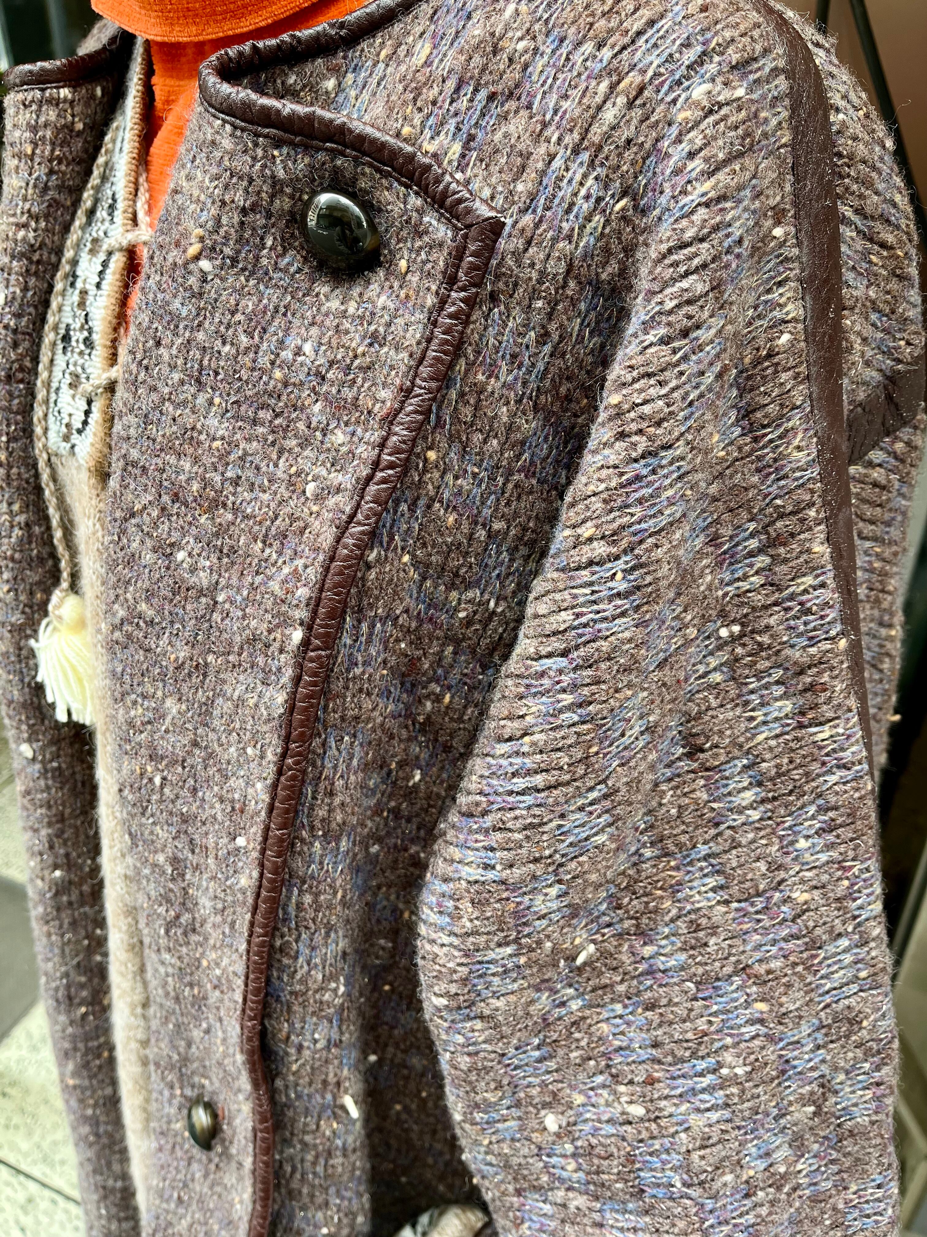 チャコールグレイの温かいウール素材にブラウンのレザーパイピンクのデザインがイカしてます!