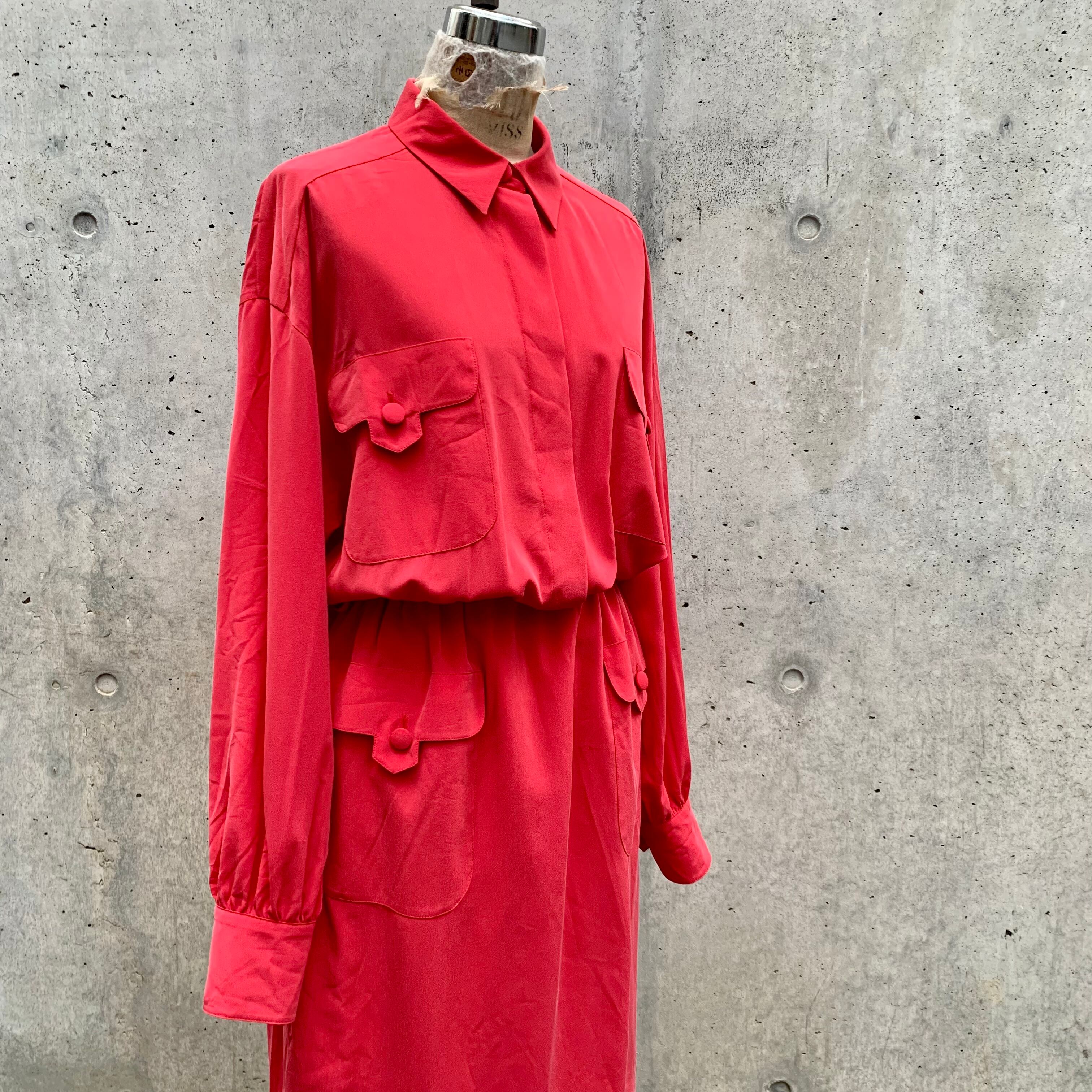 合わせた赤いワンピースは4つのフラップポケットで、つなぎのようなワークっぽい雰囲気!