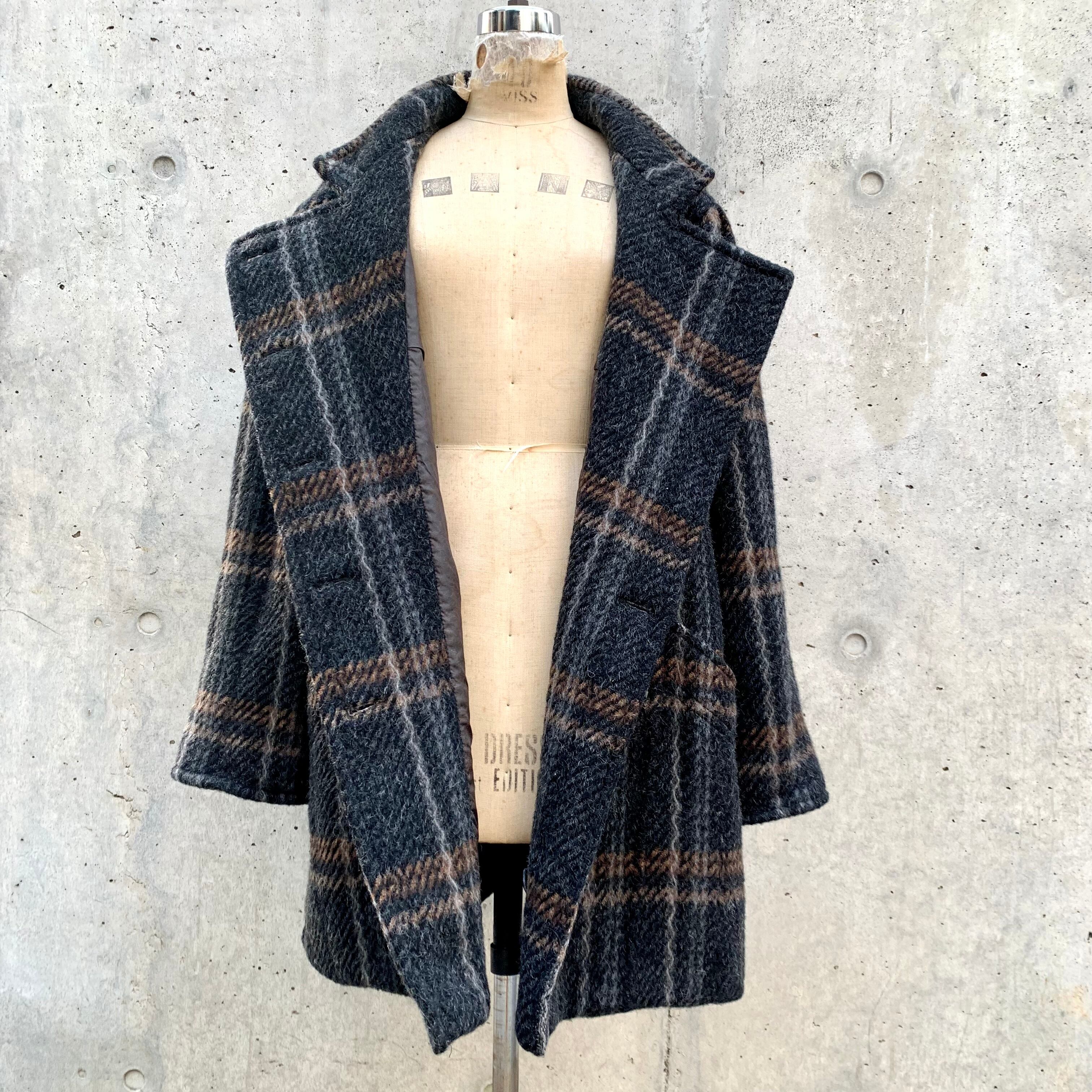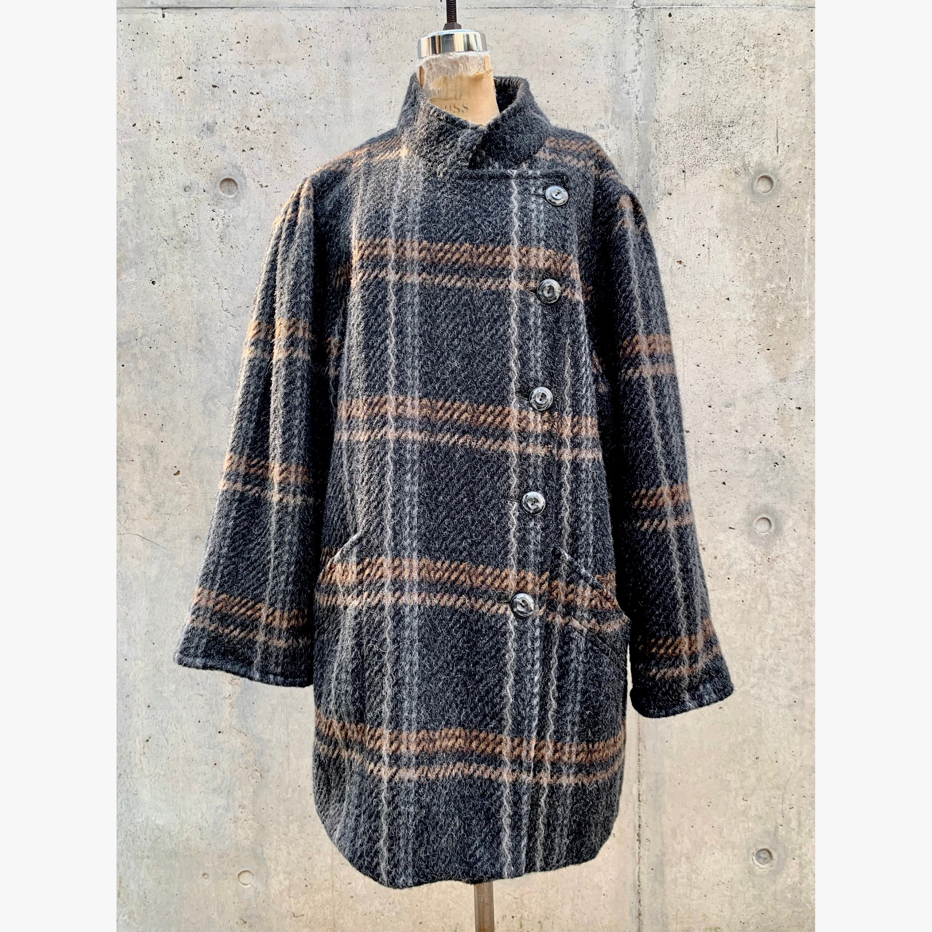 80's plaid wool stand collar puff coat
