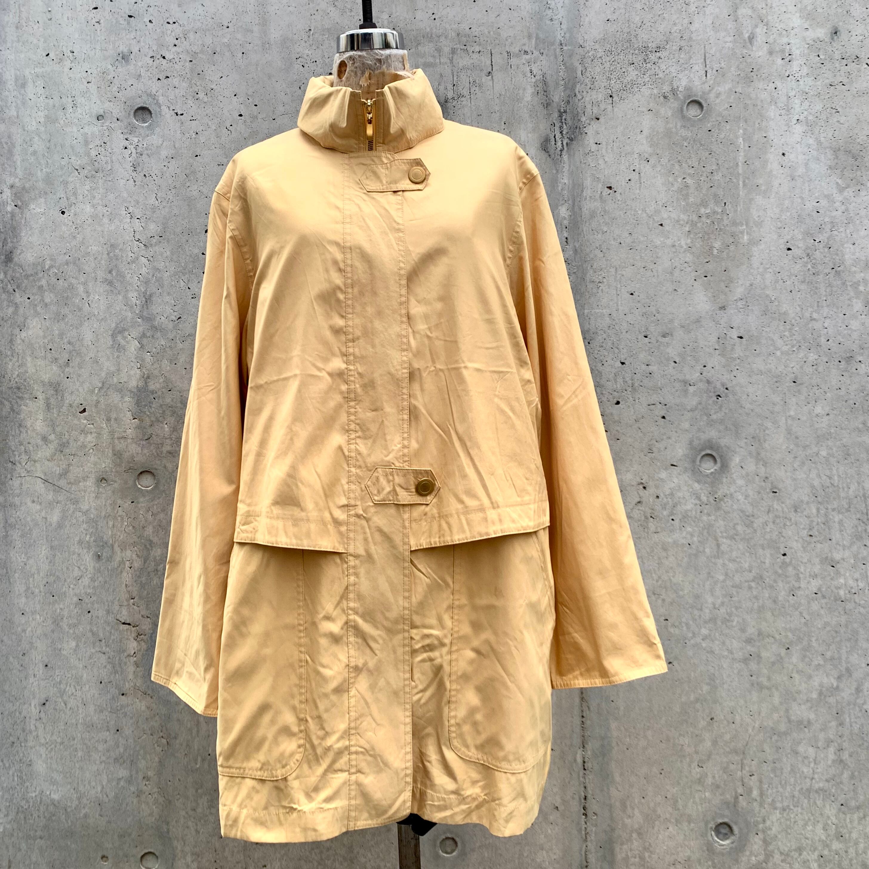 光沢がある淡いイエローの生地が特徴のミドルコート☻