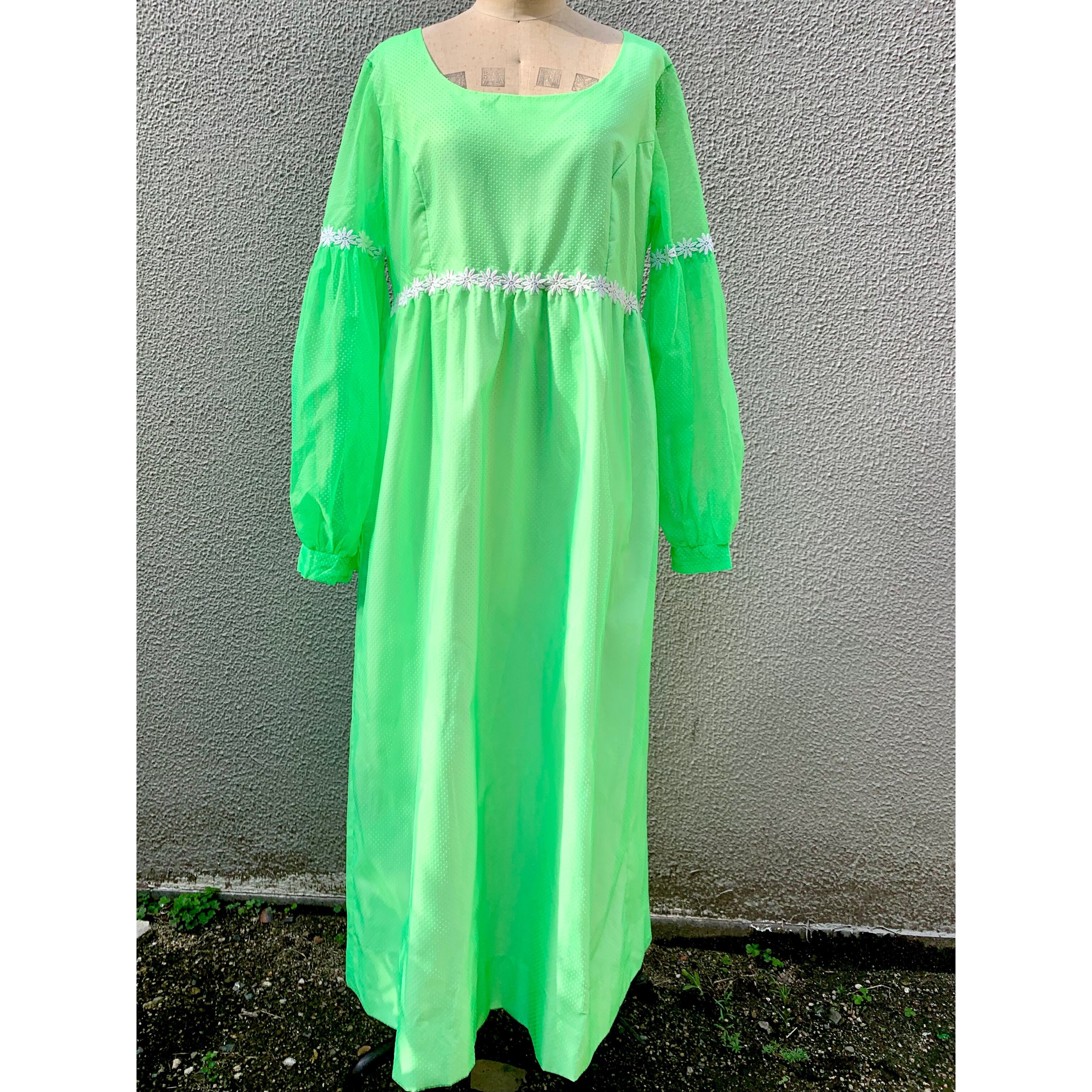 70's flower embroidery see-through dress "neon green"