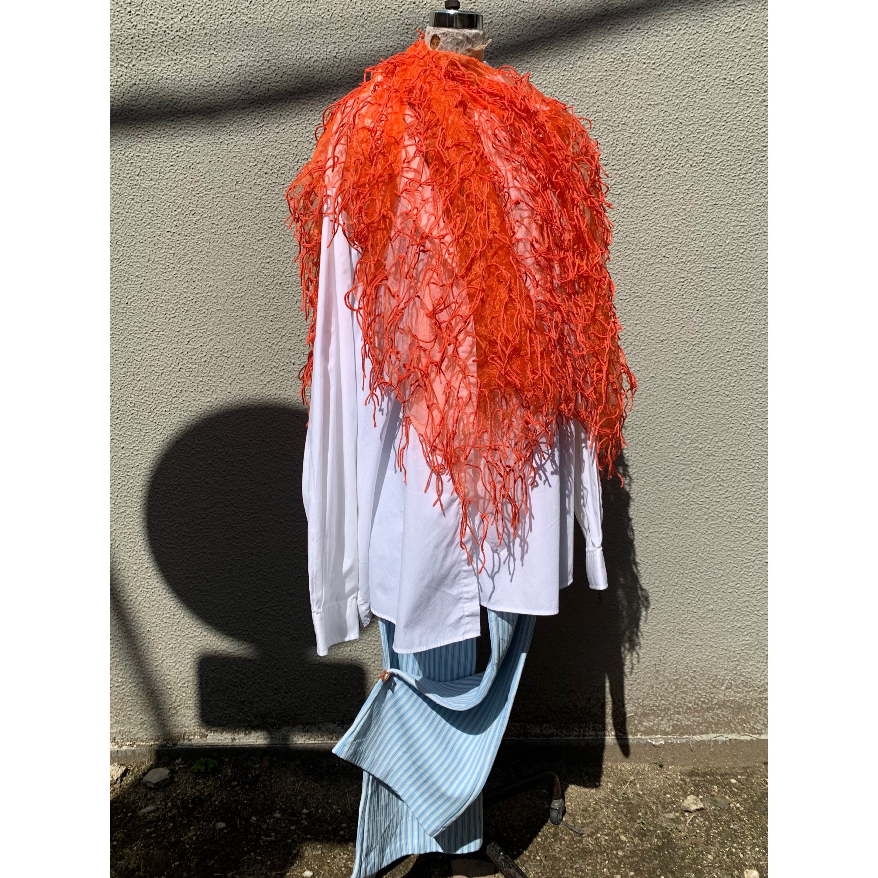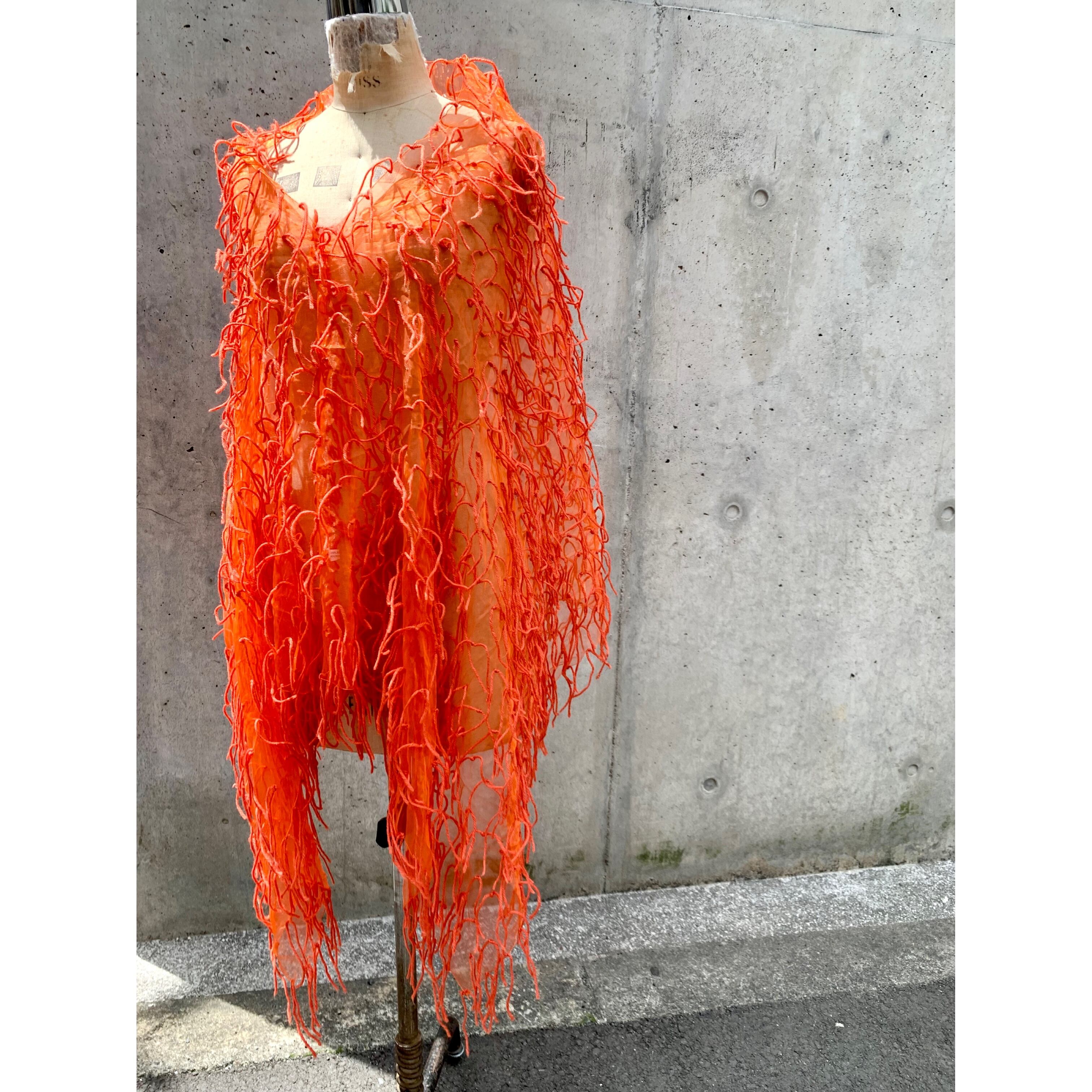 無数についた毛糸のフリンジが特徴のシースルーポンチョ。