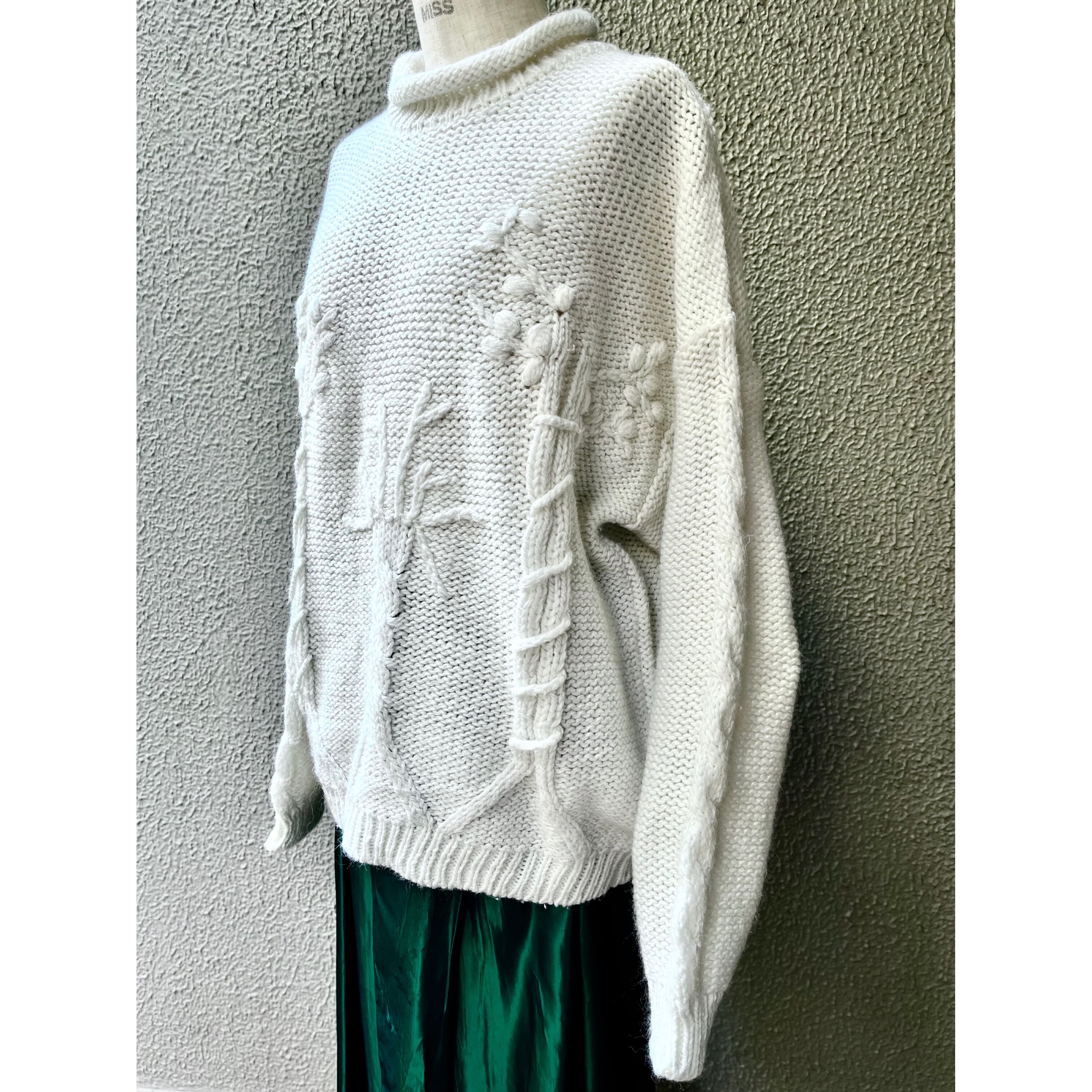 植物柄と袖のケーブル編みが特徴のハンドニット◎