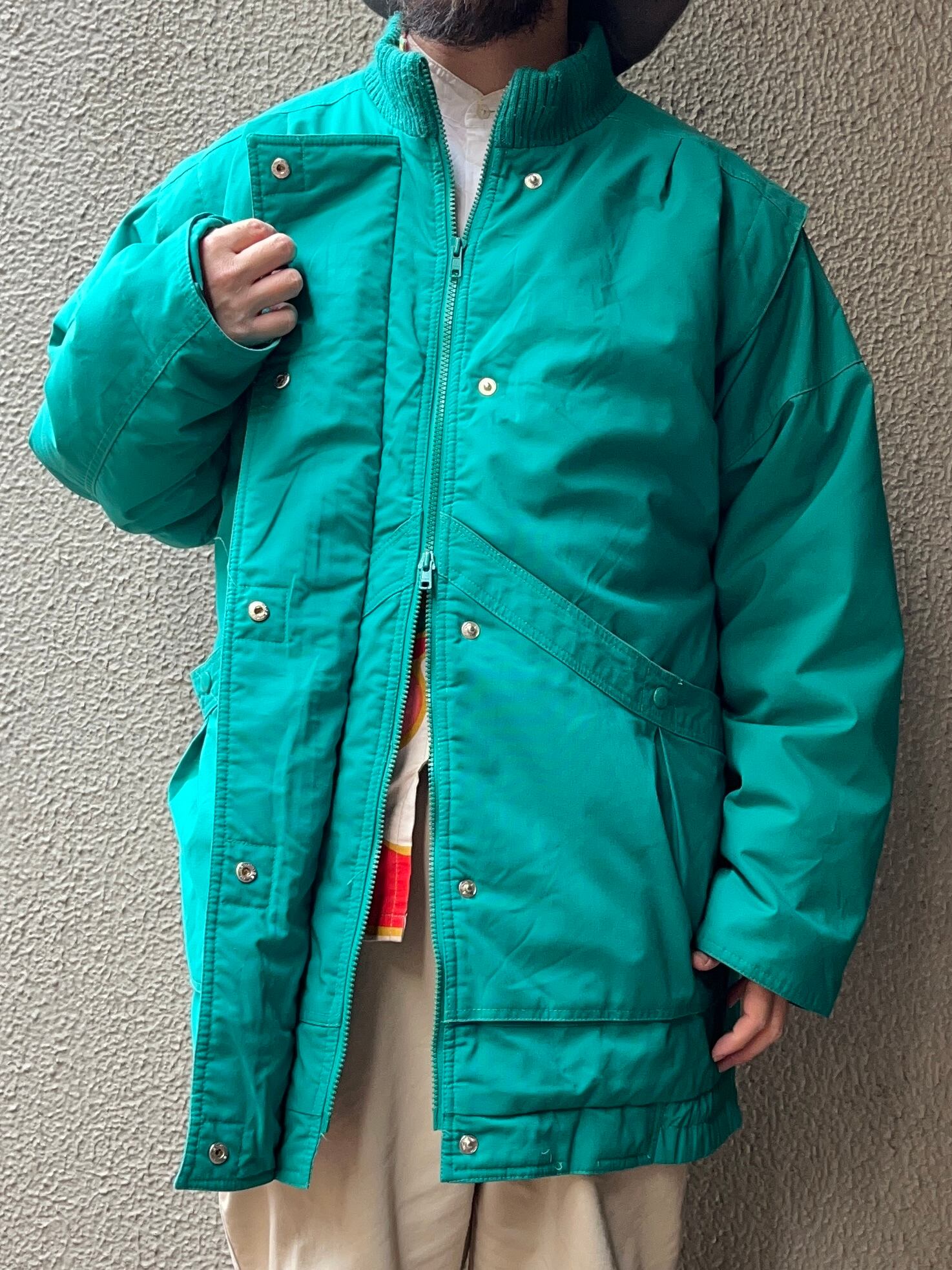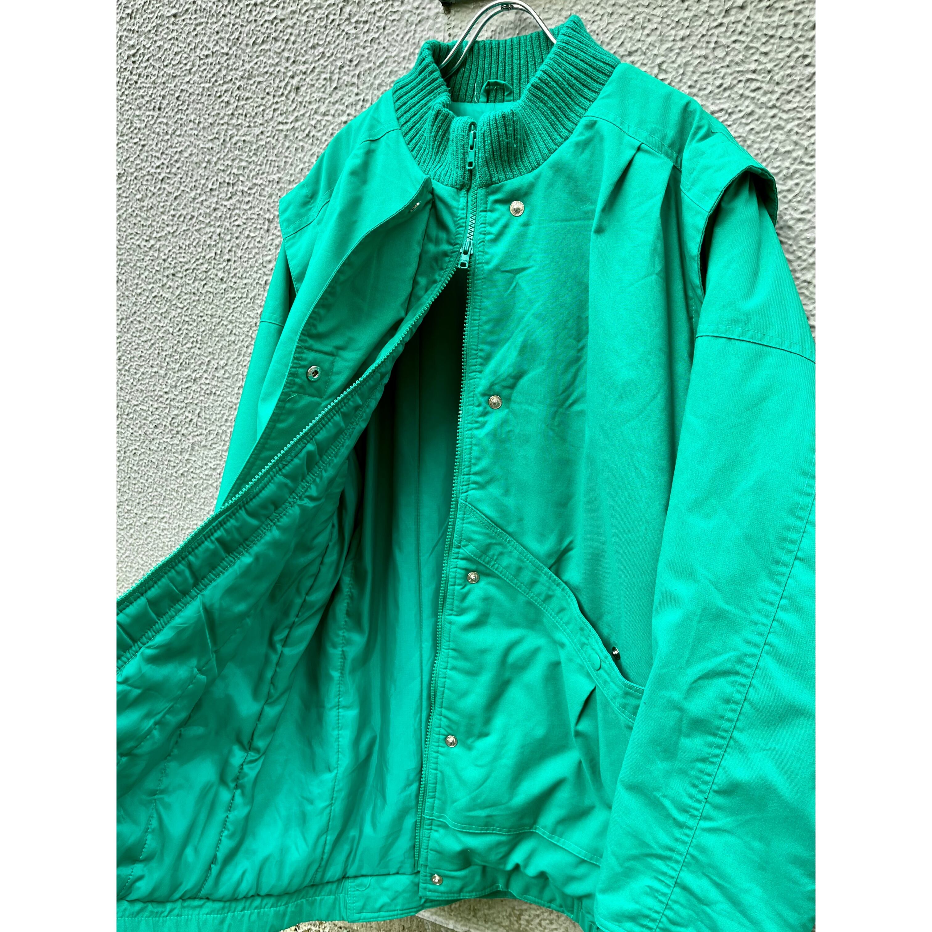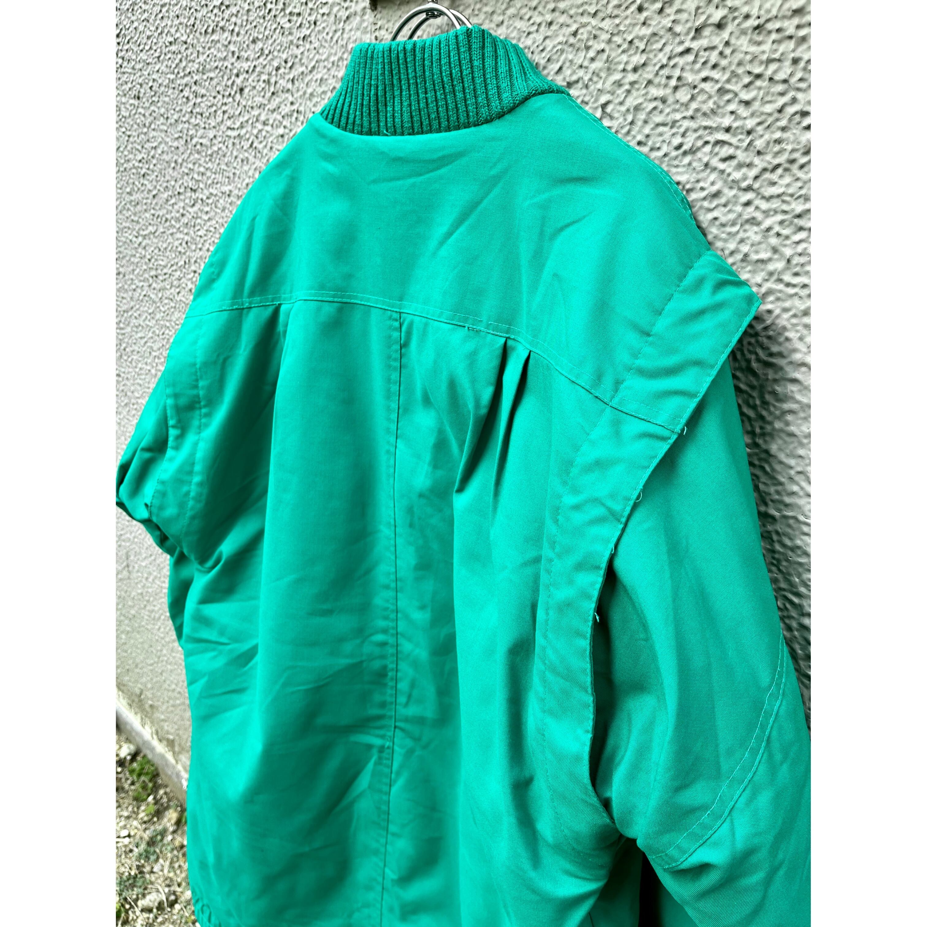 明るいグリーンのボディで、リブ・ジップ・ボタンも全て同色で統一されてます。